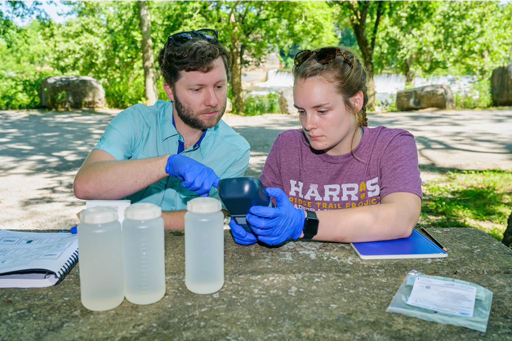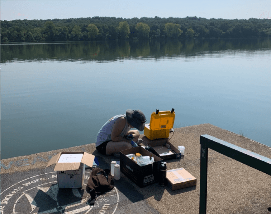 Honors Student Jaci samples water from the Stones River to sample eDNA. Samples were then sequenced to catalog eukaryotic diversity within this watershed